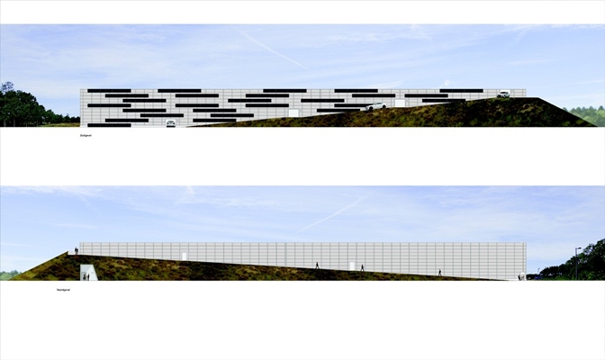 Zo'n duurzame garage vraagt natuurlijk om een groene uitstraling. De zandwal rondom de parkeergarage wordt dan ook volledig ingepland met heide.