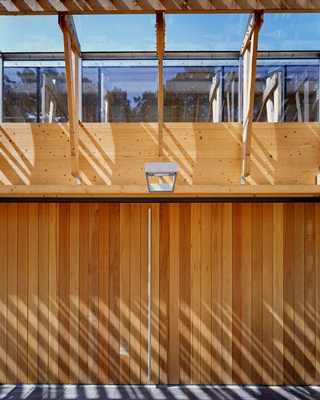 Houten kappen overspannen de ontvangst- en condoleanceruimtes. Tot manshoogte zijn deze ruimtes gesloten. Hoge lange glasstroken geven zicht op de toppen van de omringende bomen. De ruimtes hebben aan de einden een uitloop naar de besloten patio's. De aula is geheel opgebouwd uit een constructie van hoge houten spantbenen en houten kappen. Ze is tussen de spantbenen geheel verglaasd en staat als een skelet naakt in de binnentuin.