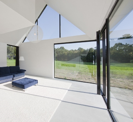 De woonvertrekken – eetkamer, keuken, speelruimte, studeerruimte – zijn gesitueerd op de begane grond en de eerste verdieping. ‘We hebben in overleg met de opdrachtgever gekozen voor oriëntatie op de vrije natuur’, aldus Hofman. ‘De zuidgevel bestaat dan ook vrijwel helemaal uit glas, vrijwel zonder onderbrekingen. De gevel aan de kant van de doorgaande weg – die trouwens op voldoende afstand ligt – is wat meer gesloten, ook uit het oogpunt van privacy.’ De begane grond en de eerste verdieping staan via vides in open verbinding met elkaar. Hofman: ‘Dat benadrukt de ruimtelijkheid die ontstaat dankzij de open indeling. Op de eerste verdieping hebben we erkers geplaatst die reiken tot de dakrand. Zo ontstaan volwaardige ruimtes met een prachtig uitzicht.’