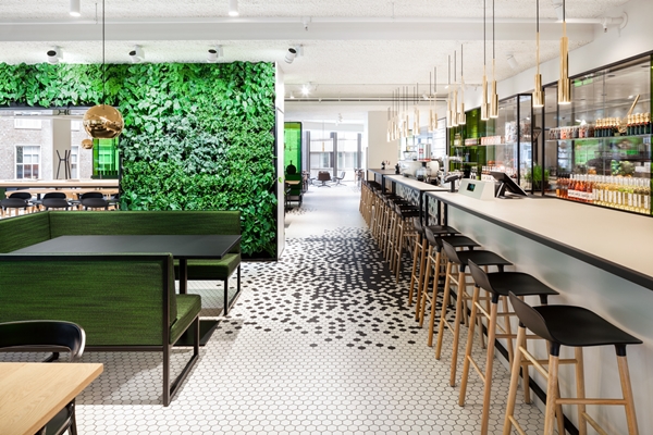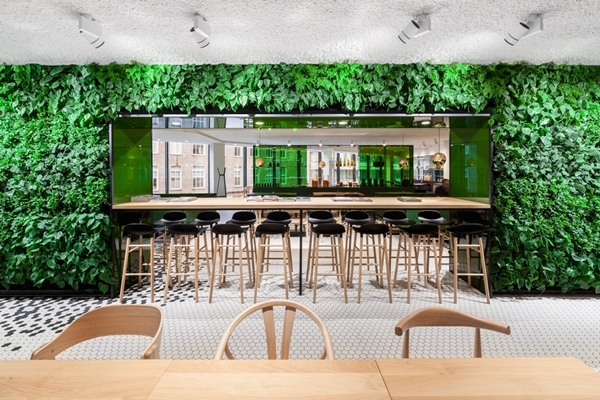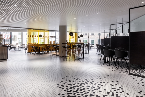 De Bijenkorf Utrecht Restaurant - by i29 interior architects Following up the first successful collaboration, the Artist in Residence Room On The Roof in Amsterdam, i29 interior architects now realized the design of restaurant ‘The Kitchen’ for De Bijenkorf Utrecht, a high quality department store offering an extraordinary customer experience. A masterplan by Rijnboutt Architects optimized the complete department store including a new facade and brand new top floor, where the restaurant is positioned. The brief was to create a unique dining experience which seduces and inspires. i29 developed a concept for the interior design expressing freshness and variety; a subtle reference to food in general, and the diversity of flavors presented in the open kitchen area. The layout reveals several spatial experiences throughout the 850 m2 open area, with a variety of seating. From private and cosy, towards more open and bright dining areas. This offers customers a choice in the way they would like to sit, eat, drink or work. Different seating areas and atmospheres are created in contrasting materials and colors with a mix from rough to luxe. Fresh food from the kitchen is visible throughout the restaurant, as all partitions are made from transparent colored glass cabinets. The open kitchen area in the center of the restaurant is a self service system, where customers can order at one of the food counters. Looking from the department store, live cooking and fresh ingredients seduces customers to wander inwards the restaurant. A triangular shaped open seating area next to the glass facade offers a diversity of furniture in black and natural wood in combination with a large lively green wall. The rough wood and plants are in contrast with the sharp glass partitions and all white ceilings. Brass details in lighting fixtures and flooring are matching to the yellow glass partitions. Fabrics are developed in custom colors to match within the overall material palette. Inspired by the company name De Bijenkorf (beehive) and it’s hexagon shaped logo referring to a honeycomb, i29 designed a lively pattern of black hexagon tiles which seams to ‘swarm’ over the light flooring, bar and counter fronts. The challenge was to create an environment that was made for heavy use, whilst still keeping quality in sharp details and natural materials. This resulted into an interior that mirrors the brand identity of the store itself, aiming for quality, luxury, creativity and youth.
