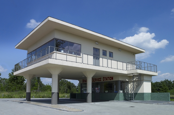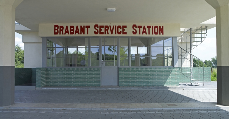 Daar waar het kon zijn de materialen hergebruikt. Ook de goede, groene stenen die nog werden gevonden. De tegels op de dakrand zijn ook teruggebracht. Toen de oude isolatie van het dak was weggehaald, kwamen die opeens naar voren. Harriën van Dijk: ‘Bij de reconstructie bleek vooral de analyse van oude foto’s heel belangrijk: hoe zat het in elkaar? Niet alleen bij details zoals de dakrand, maar ook voor de juiste metselwerkverbanden.’ In het exterieur en interieur van het tankstation is het aandeel keramiek niet onbelangrijk: de balkonvloeren zijn weer in oorspronkelijk verband betegeld en ook het sanitair en de keuken werden in jaren dertig glorie hersteld. De grootste verandering ten opzichte van het moment van oplevering is in bouwkundig opzicht de toevoeging van een trap vanuit de ruimte op begane grond naar de voormalige beheerderswoning op de verdieping. Voor de nieuwe functie als bedrijfspand bleek dat een belangrijk voordeel voor potentiële huurders. Met rode letters is het weer duidelijk telezen: Brabants Service Station. Voor een ander soort service dan die werd verleend aan de heilige koe: de typologie “wonen boven een benzinepomp” is echt verleden tijd.