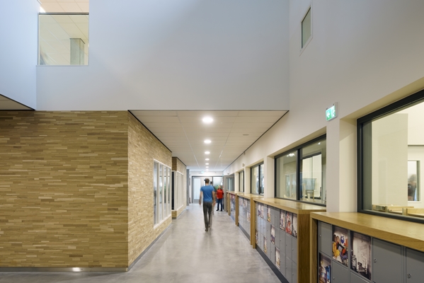 Tussen de begane grond en de tweede verdieping ligt een -qua gevel- volledig glazen ‘laag’. Deze huisvest de transparante en open functies van het HMC. De kantine, centrale entree en daarop aangesloten binnenstraat met winkels, ‘beursstands’ en belevingsruimtes zijn publiek toegankelijk en verbinden onderwijs een maatschappij. Ten slotte vormt het hoofdgebouw met haar opvallende rode lamellen de bovenste laag waarin de lokalen en onderwijsondersteunende ruimten zijn ondergebracht. In het gebouw is - hoe kan het ook anders - veel hout toegepast. Dat levert verrassende ruimtes en inspirerende detailleringen op.