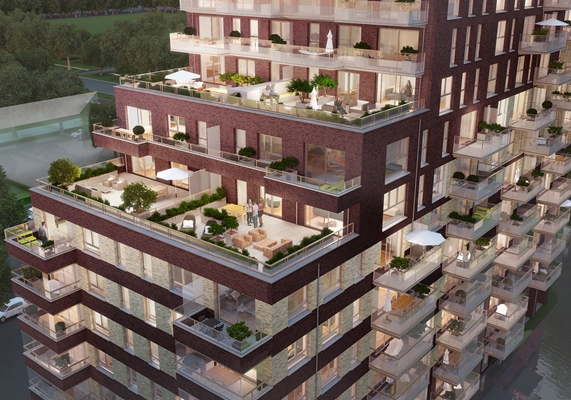 Het ontwerp bestaat uit een getrapt volume met een klassieke opbouw van plint, middenstuk en kroon. Deze benadering krijgt een uniek karakter in de materialisering. De gevel bestaat uit donker genuanceerd metselwerk. Het middenstuk wordt gekenmerkt door lichte metselwerk banden, die het donkere metselwerk onderbreken. De top bestaat uit een gevel van donker metselwerk met verdiepingshoge kozijnen. Slanke balkons met glazen balustrades zorgen voor ruime buitenruimtes met een mooi uitzicht op de groene omgeving (ook ontworpen door Rijnboutt) en het omliggende water.