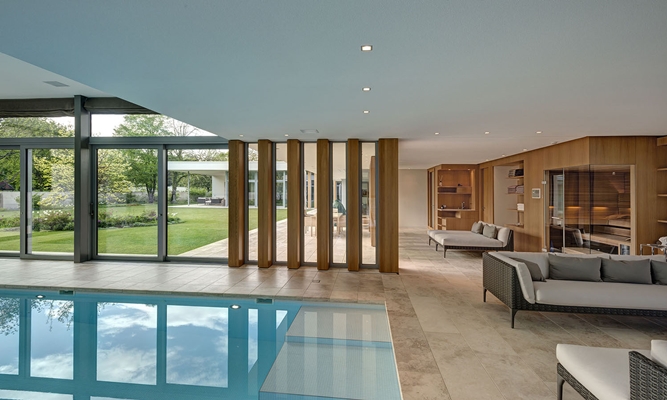 De wens van een nieuw huis met zwembad en spa voor een vierkoppig gezin op een royaal perceel in een typisch Duitse woonwijk, inclusief een ruimteprogramma dat zowel het type en de grootte van de ruimtes, evenals de gewenste ruimtelijke relaties beschreef, waren de randvoorwaarden van de opdrachtgever voor een op maat gemaakte, op het leven van de familie toegesneden villa.