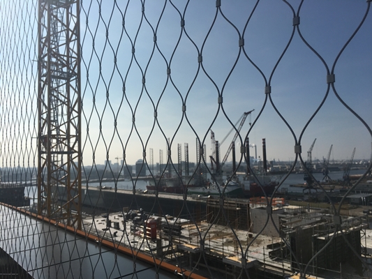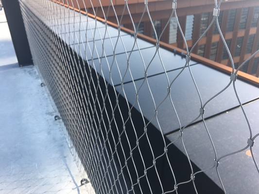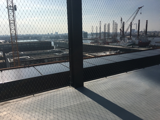 De rvs netten zijn opgespannen tussen een rondgaande kabel. De kabel wordt geleid door M12 oogmoeren. De oogmoeren staan ca. 800mm uit elkaar. In de hoeken zijn er twee naast elkaar gepositioneerd zodat de krachtafdracht bij een belasting goed afgedragen wordt naar de stalen constructie. Langs de vloer is een speciaal detail ontwikkeld waarbij stalen lippen uit de grond steken. In die lippen zitten gaten waar de kabels doorheen geleid worden.
