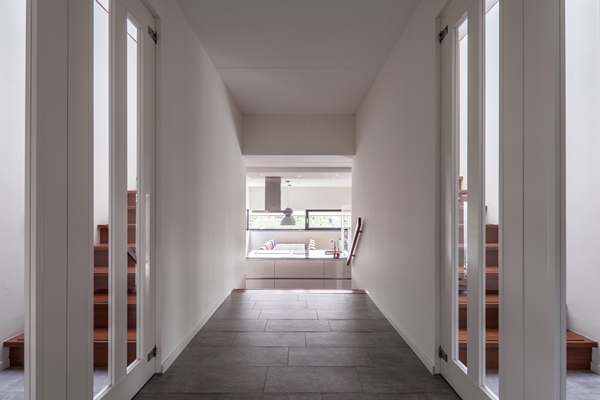 De perfect symmetrische gang verdeelt de woning in twee leefgedeelten. Eén woonkamer links en één woonkamer rechts. Ten midden van de woning bevindt zich het ontmoetingspunt; de keuken. Hier wordt 's avonds gekookt en gegeten. Vanuit de keuken voorzien bandramen fantastische vergezichten op het typisch Nederlandse landschap van Montfoort.