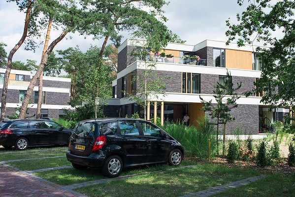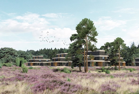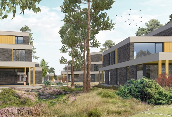 ‘Fier op de hei’ ligt in scheg 3 van Kerckebosch, aan het uiteinde van een woonstrook, op een prachtige plek tussen de hei en het bos. De kwadrantwoningen bestaan uit drie type woningen per woonblokje. Alle woningen hebben een veranda als buitenruimte die 60 cm verhoogd ligt ten opzichte van het maaiveld en overdekt is. In het landschap liggen geen privé buitenruimtes. Het landschap spoelt als het ware tussen de woningen door, het bos vanuit de zuidzijde en de heide vanuit de noordzijde. Twee wegen uitgevoerd in gebakken klinkers lopen de scheg in en gaan bij het bos over in een wandelpad. Parkeren vindt plaats op grasstenen. Halfverharde paden begeleiden de bewoners en bezoekers van de parkeerplaats naar de woning. Aan het begin van het pad staan een aantal fietsnietjes, op landschappelijke wijze ontworpen. De beplanting is inheems en passend bij het natuurlijke landschap van de omgeving. Dennen, berken, wilde appel, juniperis, varens en grassen worden toegepast. Hemelwater infiltreert in de bodem. De verlichting sluit aan op de inrichting van de gehele wijk Kerckebosch. Het geheel maakt een ontspannen en natuurlijke sfeer.