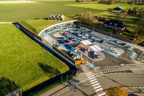 De winkel lijkt vanaf de vesting te verdwijnen, maar is vanaf de openbare weg juist zeer zichtbaar. Onder het opgetilde landschap zorgt een lange gebogen glazen wand voor openheid en transparantie van de winkel. Ook de expeditie is opgenomen onder het landschap. Een aparte expeditiestraat bevordert de veiligheid op de parkeerplaats doordat het vrachtverkeer volledig gescheiden is van het normale verkeer.