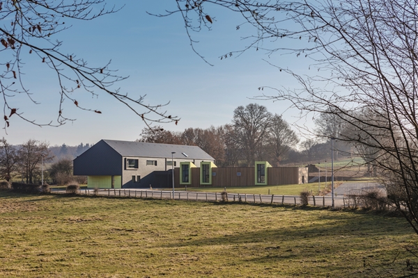 vezelcementleien, gele vezelcementpanelen en cederhout. Met haar lichte ruimtes en panoramische uitzicht op het landelijke decor vormt de school een ideale leeromgeving.