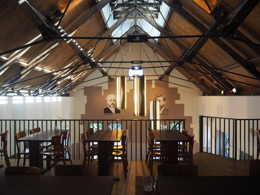 De Polonceau spanten zijn ondertussen weer volop te bewonderen en de plofkap boven het proeflokaal zorgt voor een schitterende lichtinval. Onder de andere plofkap zit een klein wonder verscholen: werkelijk alle toe- en afvoer van de ventilatiesystemen in de installaties voor de brouwerij en de horeca is in de kap opgelost, zodat de oorspronkelijke dakvorm onaangetast bleef.
