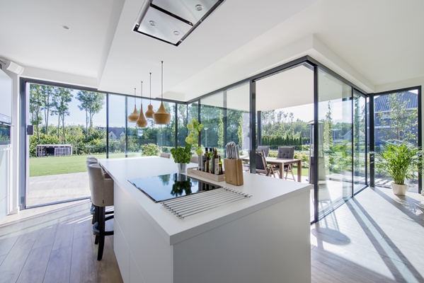 De villa in Almere, van familie de Jong, heeft een bescheiden voorgevel maar een zeer onderscheidende achtergevel. Eén die zo transparant is dat de woonkamer, keuken en veranda één ruimte lijken te vormen. Bovendien levert deze gevel een substantiële bijdrage aan de energieprestatie van de woning.Een drie-eenheid, zo omschrijft architect Guido Nobbenhuis van O5B architecten uit Arnhem de woonkamer, keuken en veranda van de Almerense villa. Hoewel de binnenruimten bouwkundig gescheiden zijn van de veranda, vormen ze optisch één ruimte. Naast de van binnen naar buiten doorgelegde houten vloer, zorgt vooral de grotendeels glazen achtergevel voor dit effect. ‘De veranda is een soort buitenkamer; een verlengstuk van de woonkamer en keuken’, licht Nobbenhuis toe. ‘Buiten op de veranda voelt het zo een beetje als binnen en andersom.’
