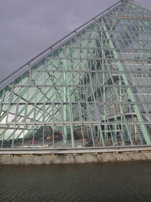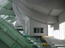 De installaties zijn overigens opzettelijk zoveel mogelijk in het zicht geplaatst. De idee daarbij was dat achter de transparante huid het complete organisme van het gebouw zichtbaar zou worden, zodat je kunt zien hoe het functioneert. Dat geldt voor de luchtbehandelinginstallaties in de nok, voor het bewegingsmechanisme van de ramen met tandheugels, voor de verlichting, en bijvoorbeeld voor de glazenwas-rail op de nokken, maar ook voor het hele ontsluitingssysteem met trappen liften en galerijen en de additionele ‘organen’ zoals het energiegebouw, de entreesluis, het ontvangstpaviljoen, het café en de crèche. Het ingetogen totaalbeeld van Crystalic blijkt door deze ontwerpbenadering bij nadere beschouwing interessante informatie te bevatten: een echt IT-gebouw.