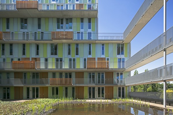De appartementen zijn ontsloten door rondom de collectieve groene binnenplaats gelegen galerijen. De overÂgangen tussen individuele woonruimte, de gemeenschappelijke ruimten en de openbare ruimte buiten zijn gedifÂferentieerd in vorm en schaal, met een flinke injectie van levend groen. Zo zijn op het kleinste schaalniveau galerijbalkons, als ruimte voor gezamenlijke toe-eigening aan twee voordeuren gekoppeld. Op het volgende schaalniveau zijn de galerijen per dubbele woonlaag gekoppeld aan de achter het Stadsvenster gelegen platformen waar gemeenschappelijke stadslandbouw plaatsvindt, waar klimplanten als groenschermen rust- en ontmoetingsplekken vormen, en waar collectieve activiteiten plaats kunnen vinden. Het hoogste schaalniveau omvat de gehele Polderkamer met zijn waterÂretentie-tuin en zijn koppeling met het verzonken atrium die licht naar de hoofdentree vanuit Postjesweg brengt.