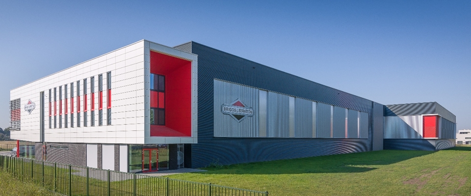 Bedrijvenpark Bijsterhuizen in het Nijmeegse Wijchen heeft er een blikvanger bij. Het distributiecentrum van Briggs & Stratton dat afgelopen zomer gereed is gekomen trekt onmiddellijk de aandacht met zijn rode details en strakke belijning. De sierkaders met rode vlakken op de hoeken van het distributiecentrum tonen daarbij een fraai stukje vakmanschap van
