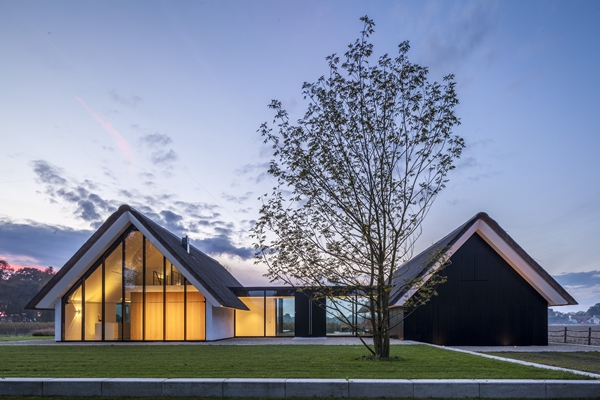 De villa ligt in een open landschap en is ontworpen in een H-vorm. Zoals in een loft zijn alle ruimtes met elkaar verbonden. Het vrijwel transparante tussenstuk dat de twee rietgedekte volumes verbindt vormt de entree.