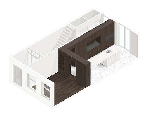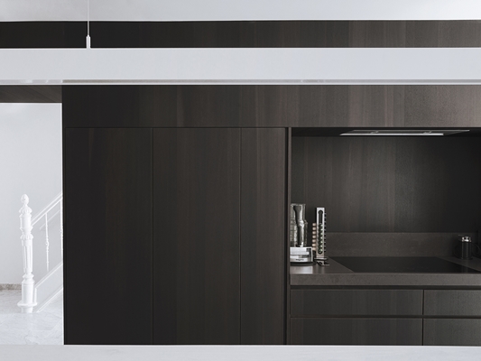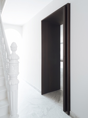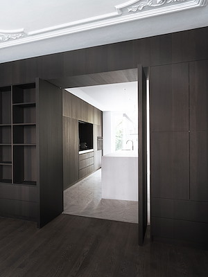 De authentieke details en ornamenten in het huis zijn abstract wit geschilderd, de nieuwe vloer in de hal en woonkeuken is uitgevoerd in gepolijst, wit marmer. De interieurbouw, die hier vervolgens aan is toegevoegd, is donker en ruw: vervaardigd uit gerookt eikenfineer zorgt deze voor contrast, warmte en intimiteit.