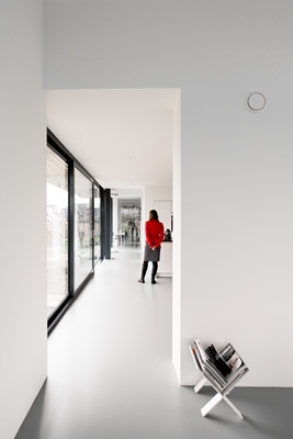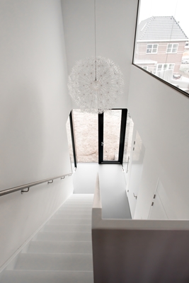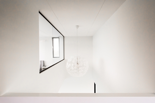 Het interieur van de woning is minstens zo eenduidig als de buitenkant. De verschillende ruimtes zijn volledig met elkaar verbonden door de binnenwanden los van de gevels te plaatsen. Grote vides tussen de slaapkamers op de verdieping geven een bijzondere ruimtelijkheid en een enorme helderheid aan de woning. Vanuit de zitruimte en de werkruimte is nu contact met de bovenverdieping en wordt je naar het hart van de woning geleid: de riante leefkeuken.De lichtval in de woning voegt een extra dimensie toe, en de gaten in de gevouwen metalen gevel brengt lichtvoetigheid in de heldere opzet van deze moderne villa.