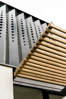 Door het optillen van de woning is een zwarte plint ontstaan die de bovenliggende volumes laat zweven boven het terrein. De entree wordt gemarkeerd door een brede, stoere trap en fraaie houten luifel. In de gevels is een abstracte verdeling gemaakt, waar open en gesloten vlakken elkaar afwisselen. Boven de entree is een in kleur en materiaal afwijkend vlak aangebracht. De grote gevouwen plaat van metaal geeft een sterk karakter en een dieptewerking aan de gevel. De ronde gaten in deze plaat zorgen op de eerste verdieping voor prachtige lichteffecten en bieden bovendien privacy aan de straatkant. Aan de afwerking van de woning is zichtbaar veel aandacht besteed.