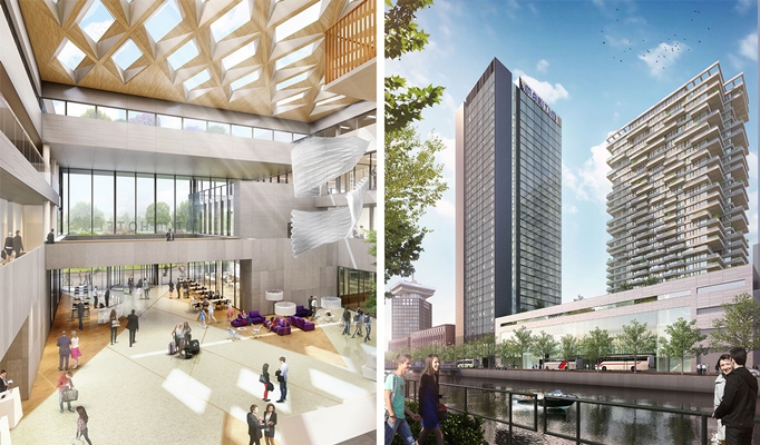 De twee torens worden verbonden door een transparante, publiek toegankelijke plint. Met diverse bars en restaurants, een congrescentrum en een luxe wellness vormt het complex een levendige ontmoetingsplek voor zowel Amsterdammers als bezoekers.