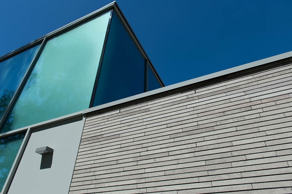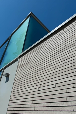 'We wonnen de prijsvraag voor dit sportcomplex omdat we zo’n sterke visie bij het ontwerp hadden’, zegt Jos Halfweeg (Mosaiek architecten). De parkachtige Noorderparkzoom in Utrecht wilden we versterken in het gebouw, en het gebouw zelf wilden we onderdeel maken van de kunst en beelden eromheen. Halfweeg vertelt enthousiast: ‘Juist door de lichtgrijze zandkleur ‘Sleeping Beauty’ van GeoStylistix past het gebouw zo goed in die natuurlijke en kunstzinnige omgeving. De gevelstenen zijn slank en chique. In combinatie met het blauwgroene matte glas verwachten mensen in eerste instantie niet eens dat dit kubistische en uitgesproken gebouw een sporthal is voor de scholen en bewoners uit de buurt. En dat is wat je graag wilt als architect: dat je ontwerp onderwerp van gesprek wordt’.