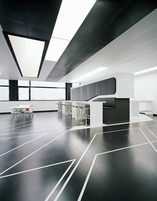 encases the office accommodation and forms the basis of the building’s dynamic shape. The slightly recessed ground floor features black steel and provides a well-defined contrast. All the different areas (underground parking, workshop, meeting rooms, offices and staff restaurant) can be accessed using either the stairs or lift, which are both located in the generously proportioned stairwell. A pleasant atmosphere has been created for employees in the staff dining room, where the flooring replicates the colours of the company logo. Light shafts in the upper storey allow additional natural daylight into the office area. Large skylights and colour accents on the windows reveal a colourful interplay of tones depending on light conditions in the visitors’ area. High efficiency technology teamed with intelligent building design come up to expectations. An efficient gas-powered combined heat and power unit provides heating, cooling and electricity supplies in the new building. Further energy saving and resource conserving measures – for instance extensive vegetation on the green roof to create a rainwater evaporation area and to recycle rainwater – ensure building 9 a considerable contribution to environmental protection. The whole building is accessible and barrier-free.