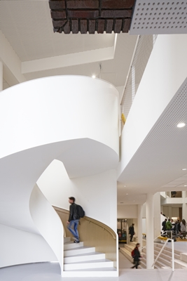 Kenmerkend aan dit ontwerp is dat we inspelen op de dynamiek van muziek. De studenten werken met ritme, melodieën en tonen. Dat hebben we ook in het gebouw laten terugkomen. Zo zijn de trappen op verschillende niveaus geplaatst. Die gelaagdheid geeft niet alleen een speels effect, maar zorgt er ook voor dat studenten en docenten elkaar vanaf de trappen kunnen zien en aanspreken.