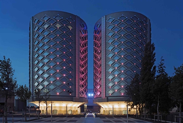 Voor de gevels werden uitgebreide kleurstudies gedaan, maar uiteindelijk is besloten ze in één kleur te bekleden met zilvergrijs aluminium. De diepte- en schaduwwerking van de vlakke, ruitvormige ramen tegen de ronde wanden bleek zo spannend te zijn dat er geen kleur nodig was. Als het donker wordt, verdwijnt dit effect, maar ’s avonds weet het gebouw opnieuw de aandacht te trekken door het fonkelende spel van gekleurde lampjes in de kaders van de ramen.