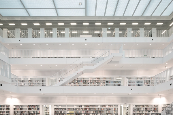 De bibliotheek van de 21e eeuw, in de directe nabijheid van het hoofdstation van Stuttgart. Voor deze bijzondere plaats ontwierp de Zuid-Koreaanse architect Eun Young Yi een kubusvormig gebouw met een sobere en gereduceerde vormgeving.