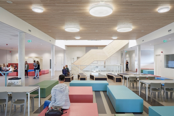 Overzicht en transparantie zijn in het onderwijs belangrijk. Daarom hebben we ook binnen veel met glas gewerkt. De lokalen hebben een glazen schuifdeur, zodat docenten vanuit de klas zicht hebben op wat er gebeurt op het leerplein. Wanneer een docent de leerlingen zelfstandig wil laten werken, kan de glazen schuifpui open. Zo dient het leerplein als verlengstuk van het leslokaal. En kunnen docenten spelen met de ruimte(s). Boven het hart van het gebouw zitten lichtkoepels die het daglicht binnen laten. Dit licht komt indirect via het trapgat op de werkpleinen uit. Door het daglicht diep in het gebouw te brengen, ontstaat een prettige sfeer.