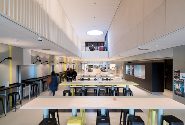 De verschillende gebruikers van het complex worden bijeengebracht in de grote centrale ‘’Stadskamer’’ waarin de zwevende bollen de collegezalen en filmruimten bevatten. Het is een landschap waarin de bezoeker, de student, de burger kan dwalen en deelnemen aan de activiteiten. Door de compacte situering van functies in een gebouw is een optimale duurzaamheid en energiearm gebouw ontstaan.
