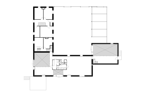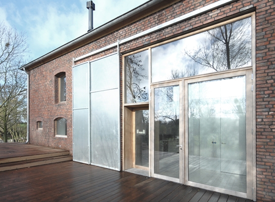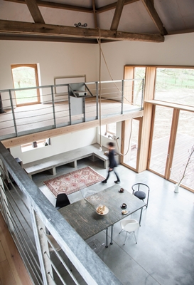 De traditionele paardenstal met schuur zijn verbouwd tot werkplaats/atelier. Bestaande gevelopeningen zijn hergebruikt, maar er zijn ook grote doorbraken gerealiseerd die het prachtige landschap inkaderen en het daglicht laten binnenstromen. Grenzend aan deze kaders zweven grote terrassen, waaronder het glooiende landschap doorloopt. In het midden van het gebouw is een roestvrijstalen kern geplaatst waarin de keuken, badkamer en het toilet zijn opgenomen. Een tweetal compleet houten ronde trappen verbindt de twee verdiepingen. Het atelier waadt in natuurlijk noorderlicht dat door een grote lichtkoepel in het dak binnenkomt.