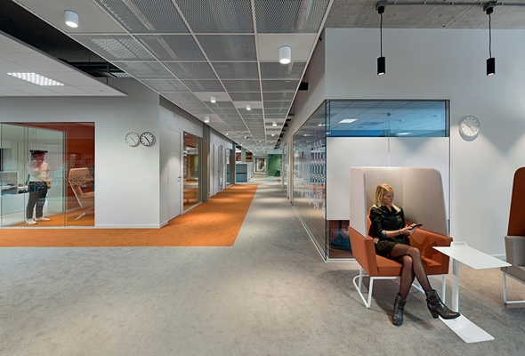 Op de eerste en tweede verdieping zijn de werkomgevingen gepositioneerd. Door middel van een vide is deze verbonden met de publiekshal en de plaza. Een hoofdroute verbindt de verschillende vlekken in de werkomgevingen met elkaar. Een vlek is een logische plaats waar bepaalde medewerkers, domeinen en faciliteiten bij elkaar in de buurt zitten. De vlekken zijn gepositioneerd rondom vrijstaande units. Plekken waar je meer in stilte werkt, zijn gelegen aan de uiteinden van het gebouw. De plekken voor samenwerken en communiceren zijn gepositioneerd in de buurt van de hoofdtrappen, het vergadercentrum en de liften zodat ze goed te bereiken zijn vanaf de verschillende verdiepingen. Centraal in de vlekken liggen de ‘huiskamers’ waar je de dag kunt starten en met collega’s kunt samenkomen. Op de eerste verdieping zijn vlekken voor de bestuurders, de domeinen Samenleving, Bestuur & Organisatie, Ruimte en het Stadsbedrijf, medewerkers van Meerinzicht en een deel van de bibliotheek. Op de tweede verdieping worden verschillende soorten werkplekken voor het Sociaal Domein gerealiseerd.