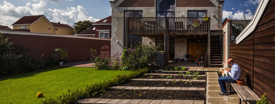 De gezamenlijke tuin biedt, door de veranda, toch ook privacy aan beide gezinnen.
