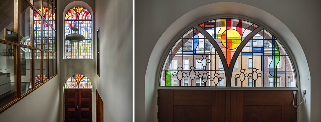 Het kerkje is horÂiÂzonÂtaal gesÂplitst in twee bijÂzonÂdere apparteÂmenten, waarÂbij toch de ruimtelijkheid van het kerkje zoveel mogelijk is behouden. De woninÂgen hebben een ruime gezaÂmenÂlijke entree over de volle hoogte van het kerkje waar de woninÂgen met een mooie pui aan grenÂzen. Het niet erg fraaie ronde plaÂfond is verÂwiÂjderd waarÂdoor de houten kapÂconÂstrucÂtie zichtÂbaar wordt voor extra ruimtelijkheid. De tuin is gedeeld, waarÂbij een veranda direct aan de achterzÂiÂjde zorgt voor priÂvacy direct bij de woninÂgen. Naast de tuin worÂden ook bergruimte, wasÂruimte, stookruimte en een klusÂruimte gedeeld.