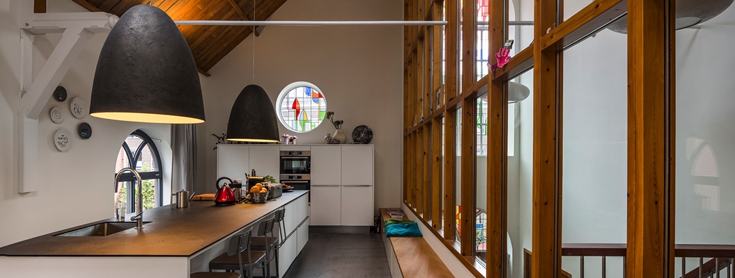 Vanuit de keuken op de eerste verdieping is de volledige hoogte van de kerk zichtbaar.
