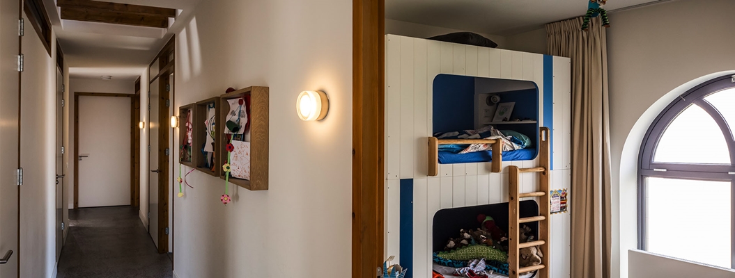 Het kerkje was ongeïÂsoleerd en in bijÂzonÂder slechte staat van onderÂhoud. De gevels zijn herÂsteld, van binÂnenuit geïÂsoleerd en van nieuwe ramen voorzien. Ook heeft het kerkje een nieuwe funÂderÂing, want het is in de loop van honÂderd jaar zo’n 40 cm lager komen te liggen ten opzichte van de straat. De nieuwe ingrepen maken het enerÂgetisch van deze tijd, met een bijÂzonÂder uitÂgekiende instalÂlatie die comÂfortÂaÂbel wonen mogelijk maakt zonÂder hoge energiekosten. Een deel van het eigen verÂbruik wordt opgewekt door een strook PV- cellen en zonÂnecolÂlecÂtoren in het grote dak.