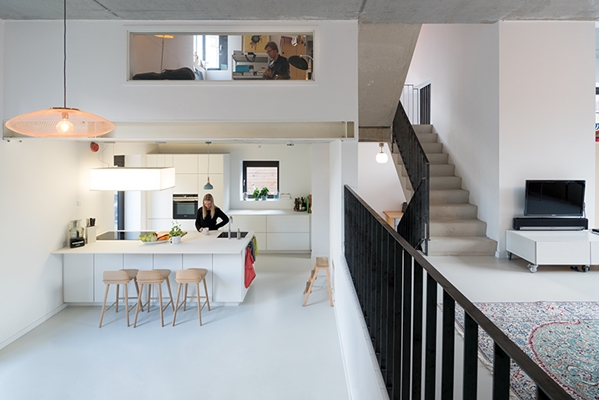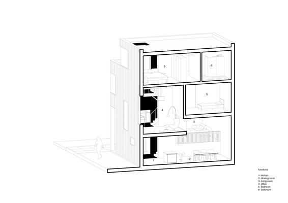 Het huis heeft een ruimtelijke 3-dimensionale organisatie die tegemoet komt aan de ingewikkelde wensen van een eigentijds stedelijk gezin: De woning biedt plaats aan gemeenschappelijke, semi-private en privé ruimten en het is tegelijkertijd verbonden als afgeschermd van de straat en de stad. Het witte exterieur bestaat uit in elkaar overlopende ruimten die georganiseerd worden door een structuur van split-level doorsneden. Het huis is een stedelijke monoliet, maar dan wel een monoliet die gloeit van intern leven.
