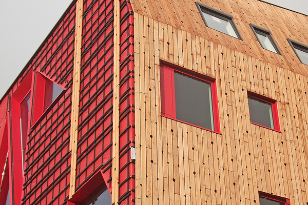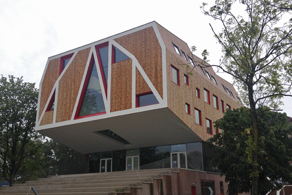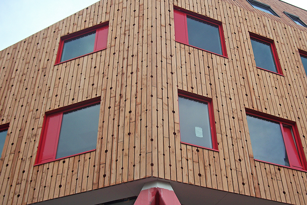 De uitbouw van het Geert Groote College in Amsterdam is voorzien van een verduurzaamde, gedeeltelijk open, vurenhouten gevelconstructie. Bijzonder is dat de planken in een vast patroon, een zogenaamde hexagon, zijn geperforeerd, waardoor de achterliggende circa 1.800 vierkante meter rode Fassawall Architectura een nog nadrukkelijker een esthetische effect genereerd. De organisch ontworpen uitbouw is van de hand van SeARCH, die ervoor zorgde dat de uitbreiding qua vorm en functionaliteit naadloos aansluit bij de door Anton van Es ontworpen bestaande bouw.
