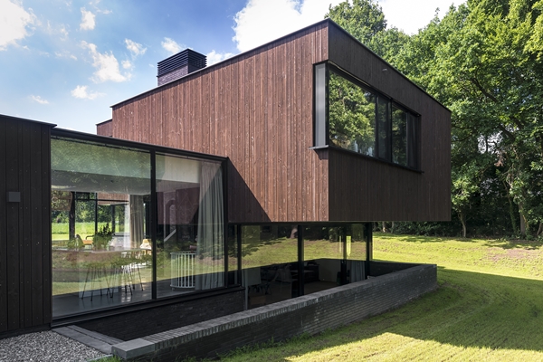 De woning ligt aan de rand van het erf, grenzend aan een openbaar toegankelijk wandelgebied. Het gebouw is opgezet als een ingetogen, strakke sculptuur met een houten omranding. Het bestaat uit twee blokken, met als verbindend element een transparant middendeel.