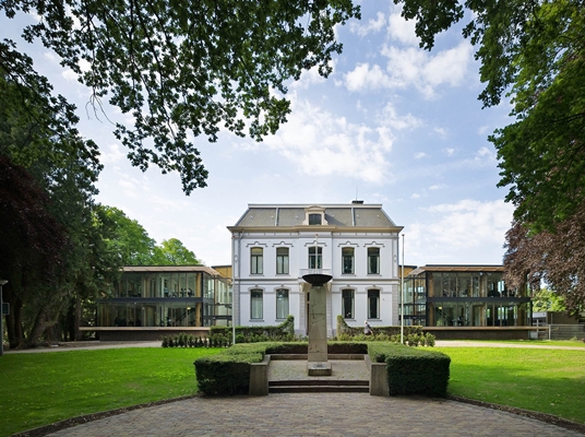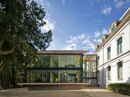 RAU heeft ervoor gekozen om de monumentale villa uit 1890 in oude luister te herstellen en daar een U-vormige hedendaagse tweelaagse uitbreiding omheen te plaatsen. De nieuwbouw vervangt de bestaande uitbreiding uit de jaren ’80. De compacte en flexibel indeelbare nieuwbouw omarmt de monumentale villa. Door een terughoudende, transparante vormgeving worden de kwaliteiten van het historische gebouw versterkt. Het omringende en sterk versnipperde terrein is als hoogwaardig park opnieuw ingericht.