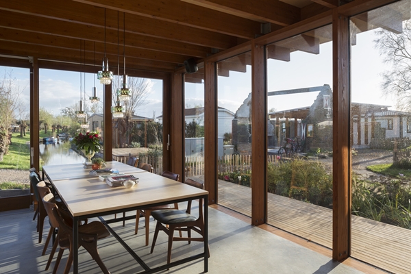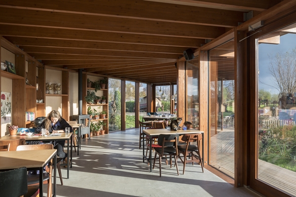 Het nieuwe koffiehuis is een huiskamer geworden voor de camping en heeft een warm en open karakter. De knik in de vorm van het koffiehuis creëert een besloten plein voor het paviljoen en geeft het interieur een mooi uitzicht op het nabije water. De constructie van het koffiehuis bestaat uit een serie van houten portalen. De achterwand heeft tussen de houten kolommen een levendige kastenwand, gevuld met persoonlijke artefacten, planten en foto’s. Aan de voorkant opent het paviljoen zich naar de omgeving met grote glasvlakken. Het uitkragende dak blokkeert in de zomer de zon en laat in de winter de zon toe voor natuurlijke opwarming.