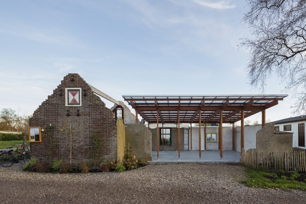 De historische gevels van de vervallen boerderij zijn behouden als herinnering aan het verleden en als begrenzing van een nieuwe buitenplaats. In deze ruïne van de oude boerderij staat nu een grote hoekbank van beton en hout waar mensen in de zomer rond een vuur kunnen zitten en BBQ-en. De overkapping naast de hoekbank biedt een droge plek om samen buiten te eten of een optreden te geven voor de buurt.