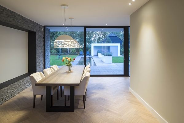 De witte kaders geven de woning een sterk elegant karakter en vormen tevens de veranda's aan de achterzijde. De plekken zijn voorzien van heaters, geluidinstallatie en verlichting, waarmee er prettige buitenplekken, ontstaan. De grote glazen puien zijn minimaal gedetailleerd, zodat de kozijnen zo min mogelijk in het zicht zijn. Binnen en buiten vloeien zo in elkaar over. Ook het element met de haarden, waarvan de natuurstenen bekleding van binnen naar buiten doorloopt, versterkt dit effect.
