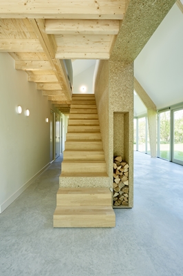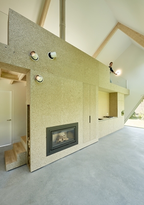Vide: bijzonder aan het huis is een grote vide, waardoor je vanaf de begane grond de houten spanten van het dak ziet. Midden in de ruimte is een opvallend houten object met daarin opgenomen de haard, het keukenblok en de trap.