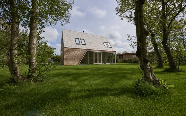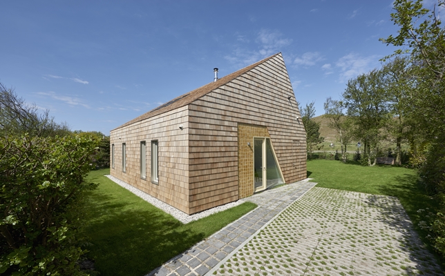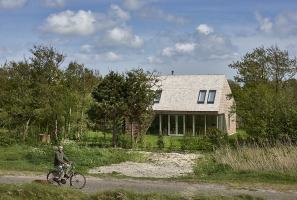 Exterieur: De buitengevel is bekleed met houten shingles, die na verloop van tijd verkleuren naar zilvergrijs en opgaan in de duinachtige omgeving. Wij hebben het vakantiehuis extra sculpturale kwaliteit gegeven door het materiaal ook op het dak toe te passen en de dakgoot en dakrand weg te detailleren. Zo vormen gevels en dak één geheel.