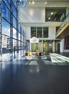 gevestigd. Die historie komt op tal van plaatsen en manieren terug in het interieur van dit L-vormige gebouw, onder meer met een ontvangstbalie die werd bekleed met een fineer gemaakt van oude kranten (