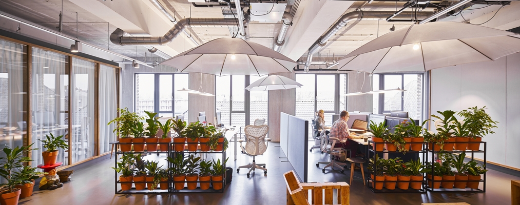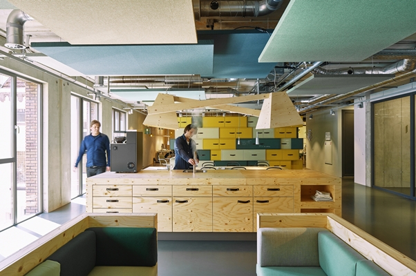 Gebruikers en bezoekers vinden moeiteloos hun weg dankzij kleurcoderingen als navigatie. Kleuren leiden je naar de beste plek voor een creatieve brainstorm, persoonlijk overleg of werkzaamheden die opperste concentratie vergen. Bij de keuze voor interieurobjecten, meubilair en decoratie maakten we zo veel mogelijk gebruik van de designs van jonge ontwerpers uit de regio. Op die manier kregen onder meer Lamp & Socket van