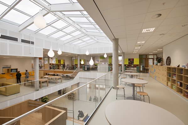 De school had als visie dat er geen dichte ruimtes mochten zijn en de directeur en docenten gewoon met de kinderen in één open ruimte zouden verblijven. Daarom vind je in het midden van het gebouw verschillende open werkplekken op verschillende niveaus en vind je in de school geen gesloten kantoorruimten meer.