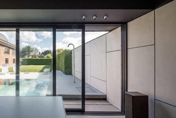 Door de grote delen van de bestaande structuur te behouden, was de ontwerper in staat een ruim poolhouse te creëren dat alle elementen in zich heeft om aan de wensen van de klant te voldoen. Materiaalkeuze was daarom de belangrijkste factor. Er werd gekozen voor EQUITONE [tectiva] TE 10. EQUITONE [tectiva] TE 10 vormt een speelse afwisseling met de zwarte materialen die gebruikt werden. Dankzij zijn strakke belijning loopt deze plaat naadloos over in de witte terrasbedekking.