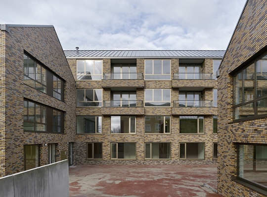 Opmerkelijk aan het zorgcomplex is ook, dat het metselwerk is doorgezet in de balkonnen. Wingender: “Dankzij de horizontale banden van metselwerk ontstaan balkonnen die echt bij het gebouw horen.” En de projectsortering gaat relaties aan met de andere gevelmaterialen, stelt Wingender: “De woningen hebben een stalen dak met een grijze dakrand, en bronskleurige kozijnen. Het samenspel van de mengsortering met deze materialen maakt de samenhang van het gebouw groter.”